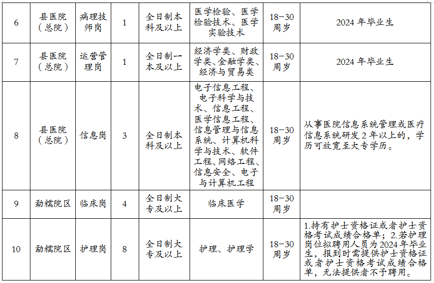 本次计划招聘53名工作人员,其中,县人民医院(总院)31人、县人民医院勐糯院区22人。