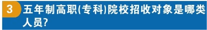 答:五年制高职(专科)院校招收参加我省当年初中学生学业水平考试的应届初中毕业生,且考试成绩须达到当年五年制高职最低分数控制线以上,按招生计划择优录取。
