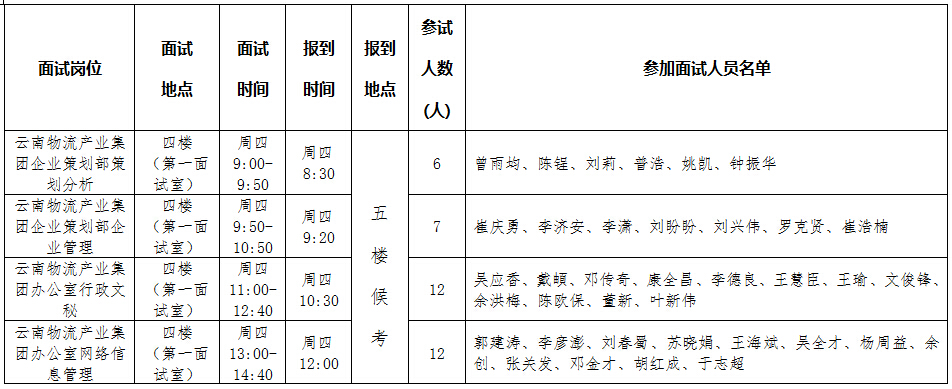 云南物流产业集团2015年度公开招聘工作人员面试工作,定于2015年4月16日(周四)至4月17日(周五)在集团本部办公楼进行,现将有关事项通知如下: