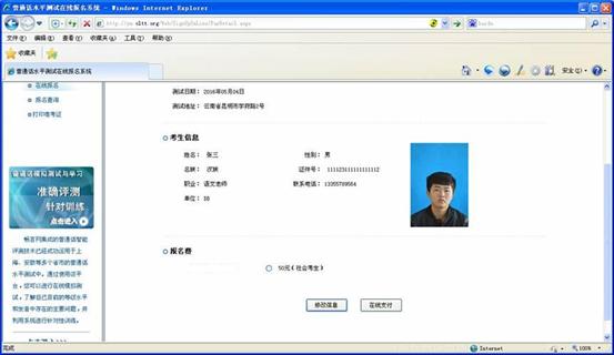 第二步:信息无误后,点击上图中“在线支付”按钮,进行网上缴费(网上支付的时限为网上报名后1个小时内,超时系统自动取消订单,考生本次报名无效)。在线支付目前只支持银联支付方式。