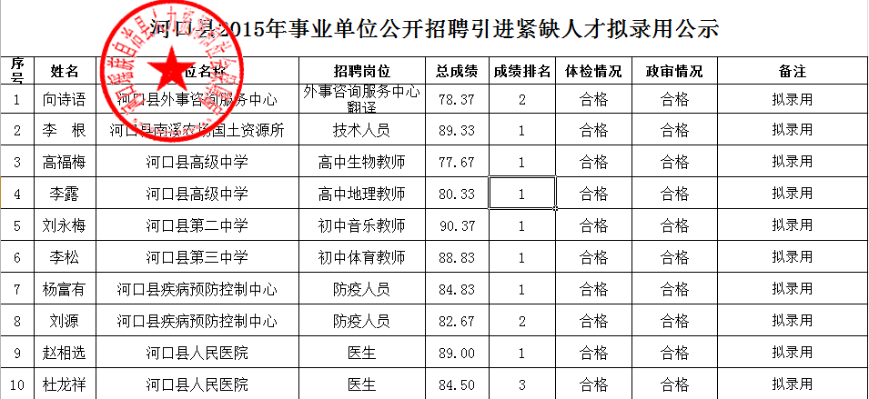 河口县2015年事业单位公开招聘引进紧缺人才拟录用人员公示