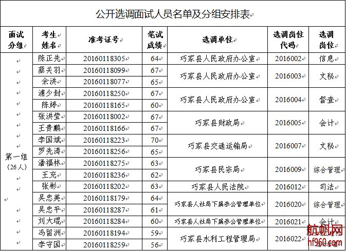 经巧家县2016年县直机关事业单位公开选调工作领导组研究决定,本次公开选调笔试最低合格分数线确定为50分,即参加面试的人员笔试成绩须达到最低控制分数线50分及以上方可进入面试。进入面试人员名单及面试分组如下: