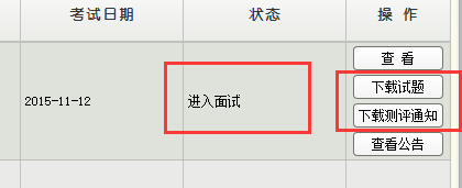 当考生通过资格审核并且缴费确认完成后,就能够分配考场与考试时间,考场与考试时间分配完成后进入面试这个阶段,登陆后就能看见下载测评通知书与下载测评文件的按钮