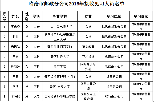 2016年临沧市邮政分公司见习人员面试拟接收情况公示