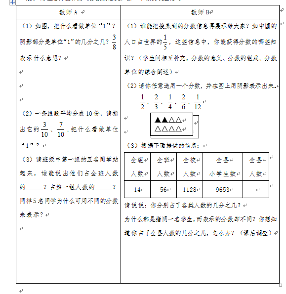 表:两位老师设计的《分数的意义》第一节课的巩固练习