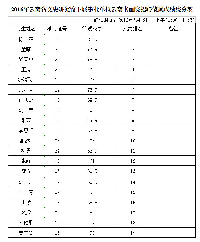 云南书画院招聘笔试成绩统分表