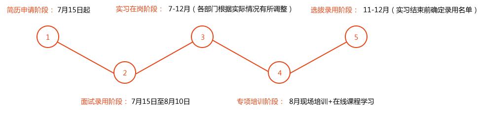在招聘的页面选择想要申请的职位,注册并完整地填写申请表上所有信息,即可成功申请校园招聘/实习生招聘。网申—面试—实习—培训+测评+考核—签约三方—正式入职简历申请阶段:7月15日起面试录用阶段:7月15日至8月1日实习在岗阶段:7-12月(各部门根据实际情况有所调整)专项培训阶段:8月现场培训+在线课程学习选拔录用阶段:11-12月(实习结束前确定录用名单)