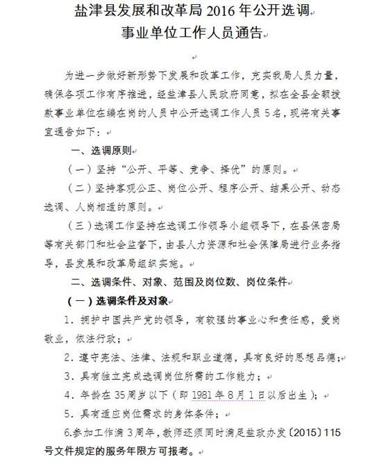昭通市盐津县发改局2016年选调事业单位人员通告