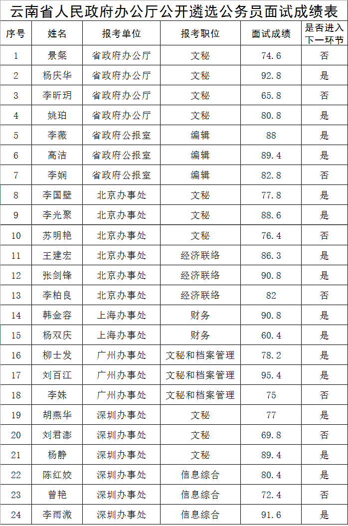 云南省政府办公厅2016年公开遴选公务员面试成绩公告