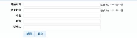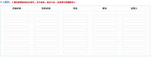 首次在网上申报填写注册信息时,可直接在表格中按时间先后顺序依次输入每条简历,不得少于两条,最多输入八条。每一条简历的开始时间、结束时间、单位、职务和证明人都不能为空。如下图所示: