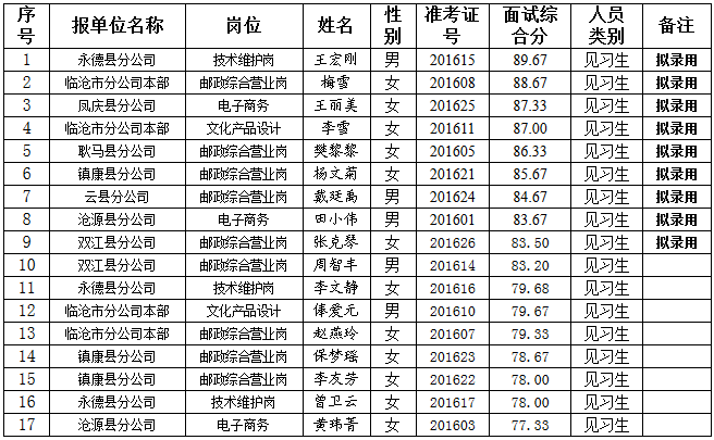 根据云南省人力资源和社会保障厅《云南省高校毕业生就业见习工作实施意见》(云人社发〔2009〕132号)、《关于进一步做好我省高校毕业生就业见习工作的通知》(云人社发〔2010〕237号)和《关于进一步规范我省高校毕业生就业见习工作的通知》(云人社发〔2011〕323号)的有关规定,为近三年毕业的大学生提供学习的岗位,结合临沧邮政岗位需求,按照“公平、公正、公开”的原则,中国邮政集团公司临沧市分公司择优招用见习人员考核考评工作已结束,经纪检监察审定,现将择优招用见习人员拟录用情况及成绩进行公示,具体如下: