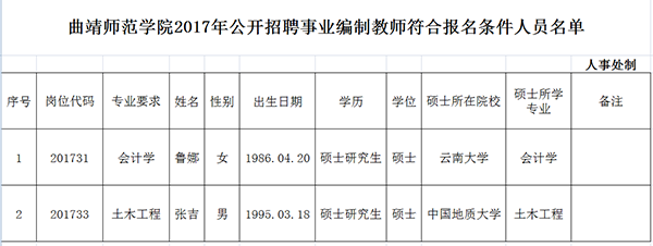 附件:曲靖师范学院2017年公开招聘事业编制教师符合报名条件人员名单