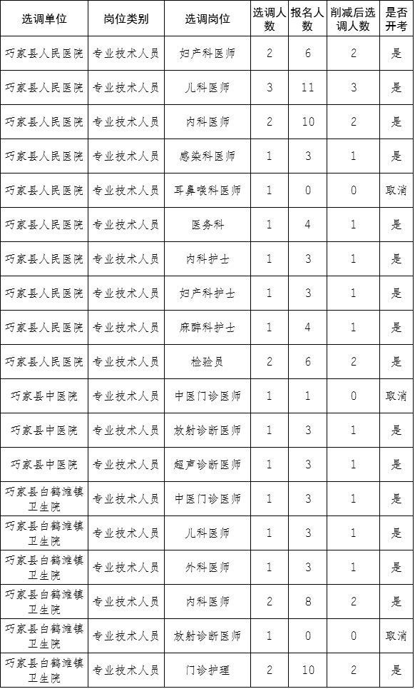 巧家县2017年县城规划区内医院公开选调医务人员岗位情况公示