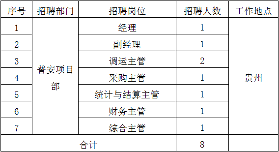 根据工作需要,现公开招聘普安项目部经理等岗位8人。具体事项如下: