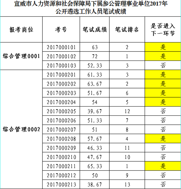 根据《中共宣威市委办公室 宣威市人民政府办公室关于印发〈宣威市市直机关公开遴选公务员实施办法(试行)〉的通知》(宣办发〔2017〕114号)规定,按照《宣威市人力资源和社会保障局下属参公管理事业单位2017年公开遴选工作人员公告》的程序安排,本次遴选笔试工作现已结束,现将笔试成绩及笔试后有关事项公告如下: