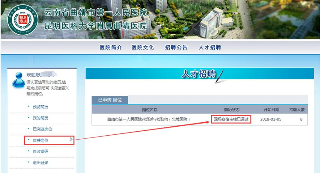 二、所有考生自行登录招聘系统应聘岗位查看现场审核状态,显示“现场资格审核已通过”,(如下图所示)为审核通过,若已参加现场审核并明确审核通过,但系统显示为未通过,请携带材料到曲靖市第一人民医院人力资源部再次审核。(2018年1月31日18时前)