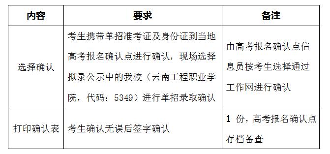 (二)2018 年3 月26日8 时—3 月28 日18 时单招拟录院校专业确认(如有变动,以云南省招考频道公布的时间、要求为准)。云南省招考频道网上公示拟录名单中的考生,必须到当地高考报名确认点进行签字确认,被两所及以上院校拟录公示的考生,只能选择一所院校进行签字确认。不参加签字确认的考生视为自动放弃单招录取。