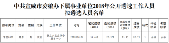 根据《中共宣威市委办公室 宣威市人民政府办公室关于印发<宣威市市属事业单位公开遴选工作人员实施办法 (试行)〉的通知》(宣办发〔2017〕115号)规定,按照《中共宣威市委编办下属事业单位2018年公开遴选工作人员公告》的程序安排,本次遴选笔试、面试、经历业绩评价、体检和组织考察工作已经结束,现将拟遴选人员公示如下,公示期为7天(2018年5月10日至2018年5月16日)。