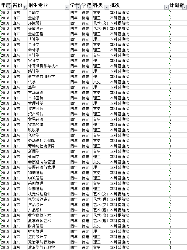 云南财经大学2018年本科分省招生计划表(山东)