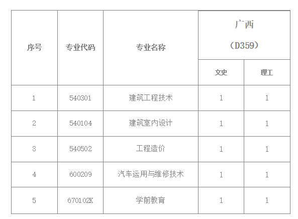 云南城市建设职业学院2018年高职(专科)广西分专业计划表 填报志愿代码D359