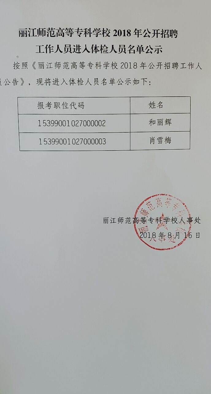 丽江师范高等专科学校2018年公开招聘工作人员进入体检人员公示
