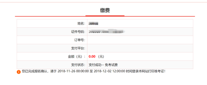 二、减免申请审核通过后,报名系统“支付状态”栏会显示“支付成功—免考试费”提示(如图示),已经缴纳报名费的考生将由收费平台在确认工作结束后进行退费,还未缴费的考生可不再缴费。如果未显示图示界面的考生,建议先支付报名费,防止影响考试。