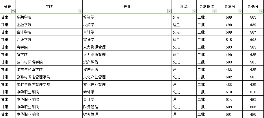云南财经大学2018年甘肃省录取情况一览表