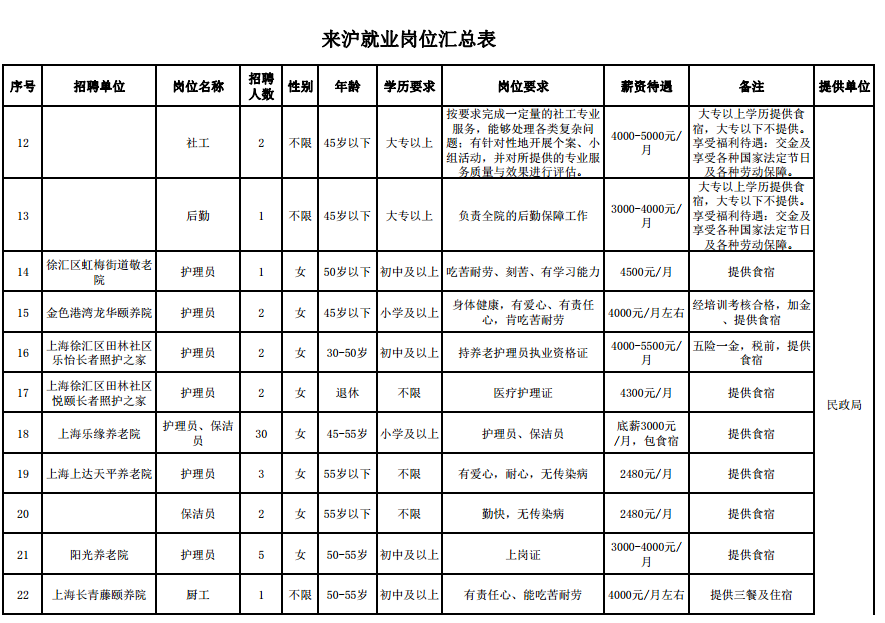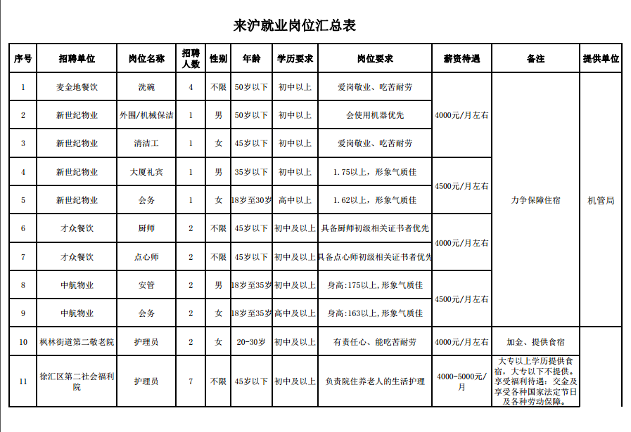 | 20 | 上海徐诚家庭(政)服务部 | 家政服务,日用品、文教用品销售。 | 保安员 | 20 | 18-45 | 初中以上 | 要求:主要为客户单位提供门卫、巡逻、守护、随身护卫、秩序维护、安全检查等,站立时间较多,上下班可能需乘坐公交或地铁,需能适应。主要是招男性,18-35周岁,个别项目年龄可放宽到45周岁,要求身高1.70m-1.86m;五官端正,无精神、传染及慢性疾病,无纹身、刺青、秃顶及斜视,无违法犯罪等不良记录;手指无残缺,面部无大的疤痕或肉瘤等;中共党员、退伍军人优先;责任心强,服从公司管理,有较强的安全意识。 | 4500~7000元(具体根据单位和项目的实际情况决定,包含加班费) | 部分提供食宿,部分只提供住宿(具体根据项目实际情况决定) | ||