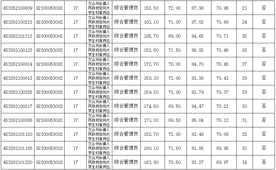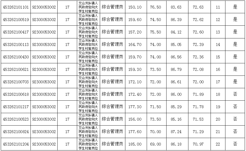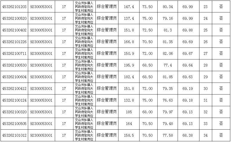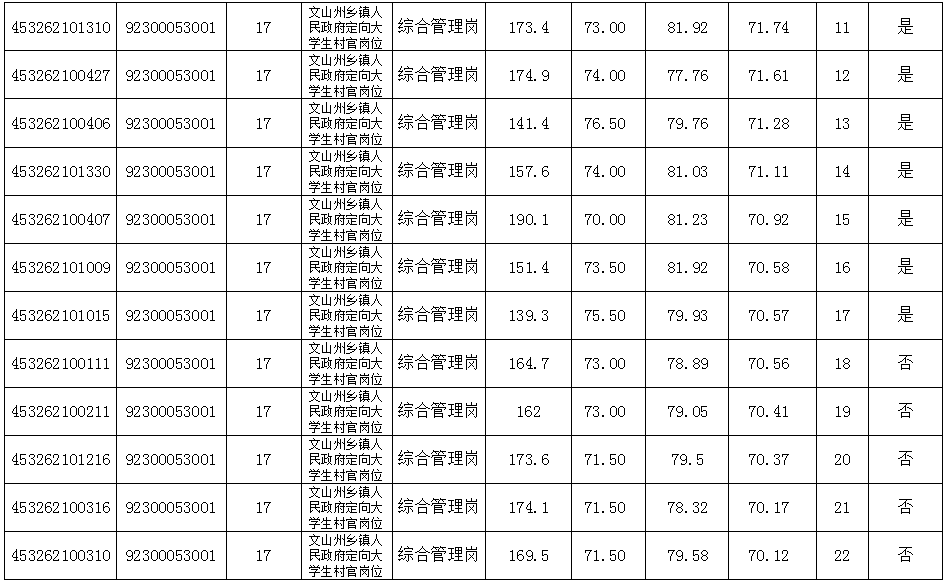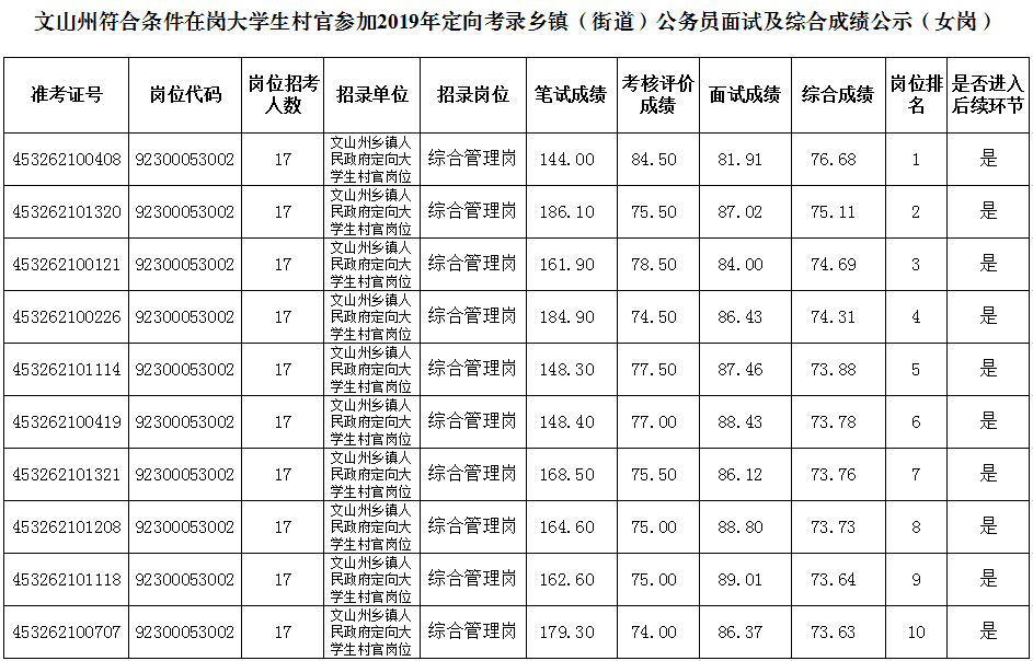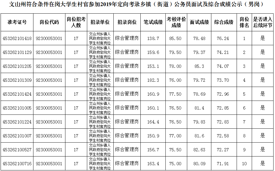 文山州大学生村官2019年乡镇(街道)公务员面试及综合成绩公示