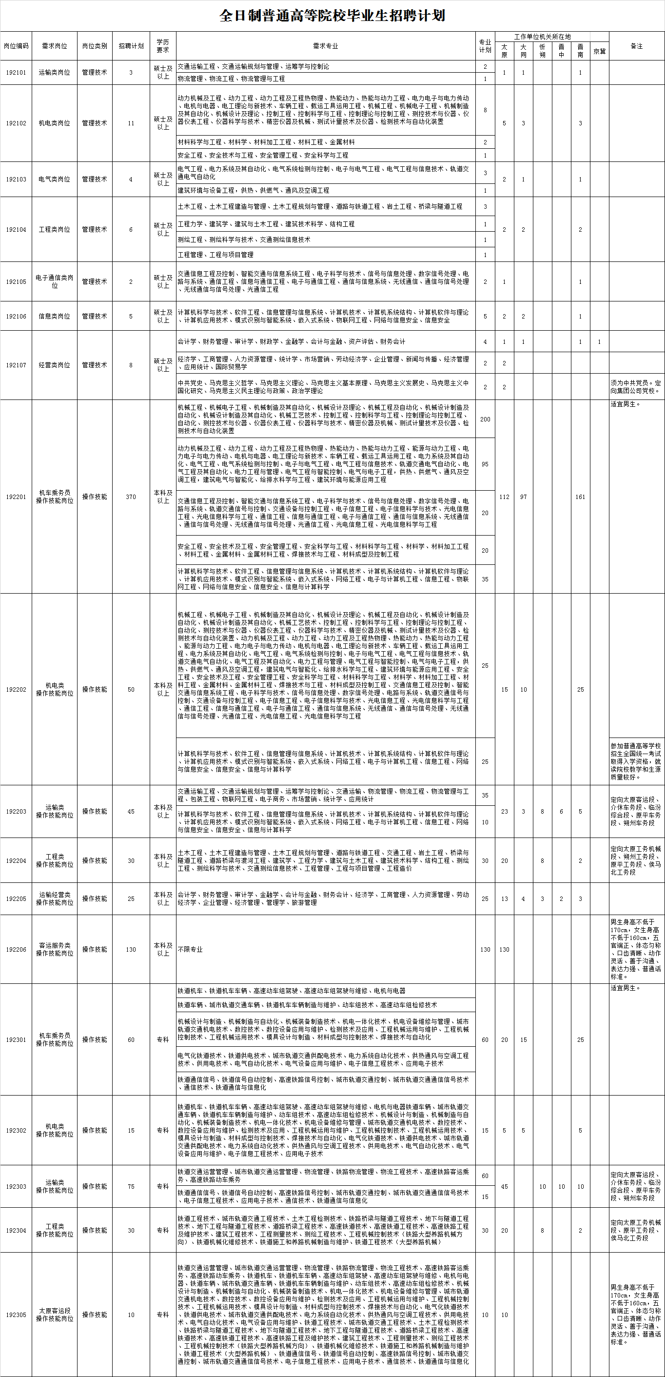 中国铁路太原局集团有限公司2019年全日制高校毕业生招聘公告(三)