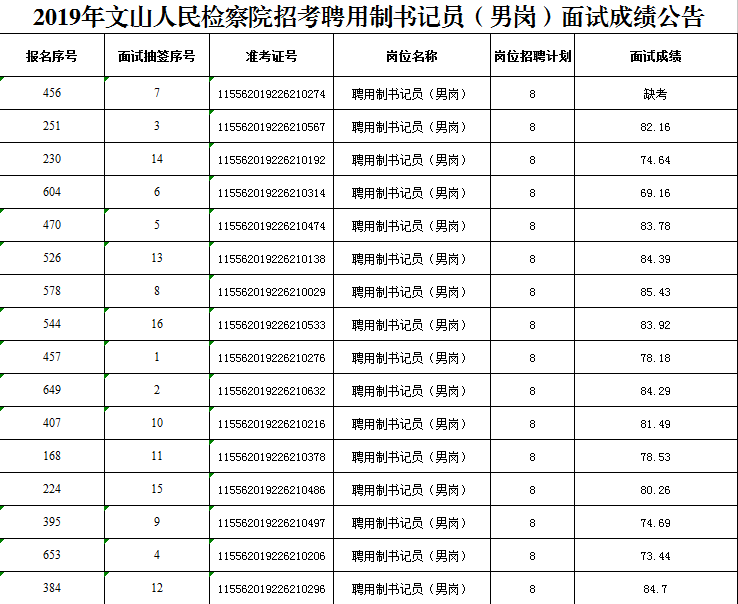 2019年文山人民检察院招考聘用制书记员面试成绩公告 根据《文山州人民检察院关于公开招考聘用制书记员的公告》,2019年文山州检察院招考聘用制书记员面试工作已于8月27日完成,现将面试成绩公告如下:
