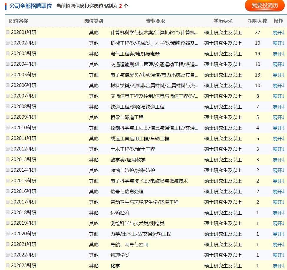 本次计划招聘具体岗位及要求详见《中国铁道科学研究院集团有限公司2020年招聘全日制普通高校毕业生需求信息表》(附件)。