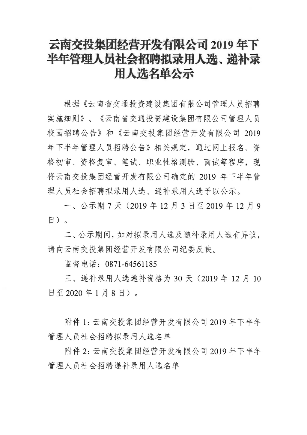 云南交投集团经营开发有限公司2019年下半年 管理人员杜会招聘拟录用人选、递补录用人选名单公示