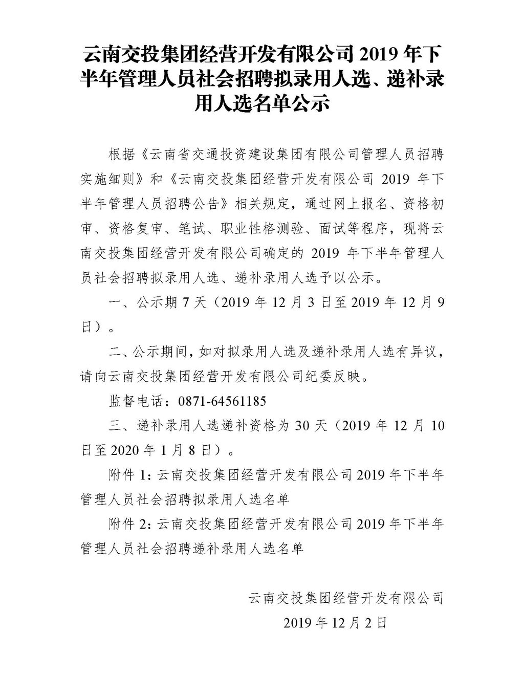 云南交投集团经营开发有限公司2019年 下半年管理人员社会招聘拟录用人选、递补录用人选名单公示