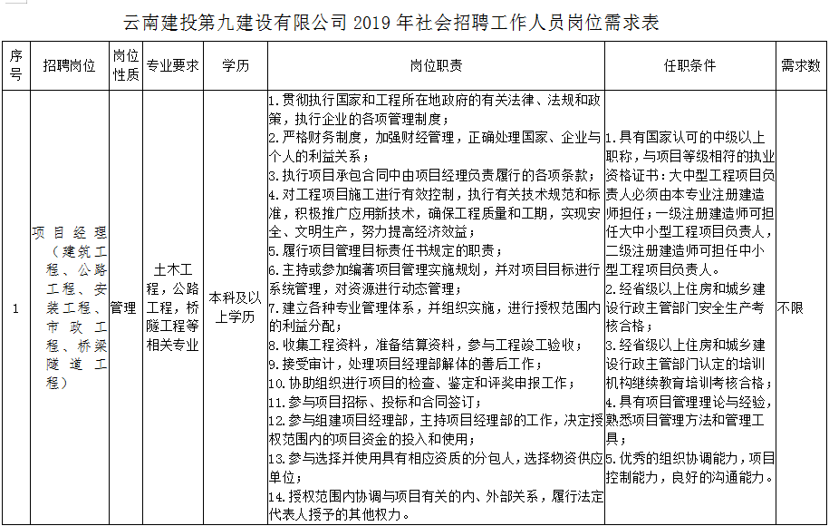 与原单位签订正式合同,最高学历大专及以上,有一定的项目管理经验,持有建造师证书或者中级以上职称证有限考虑。