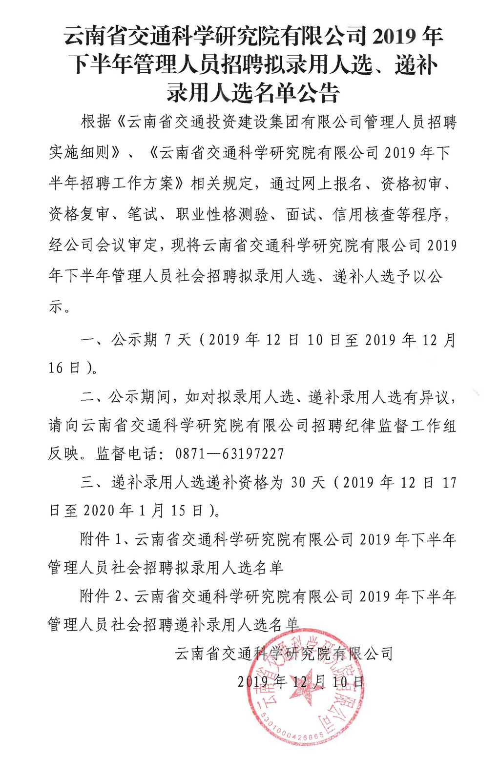 云南省交通科学研究院有限公司2019年下半年管理人员社会招聘递补录用人选名单