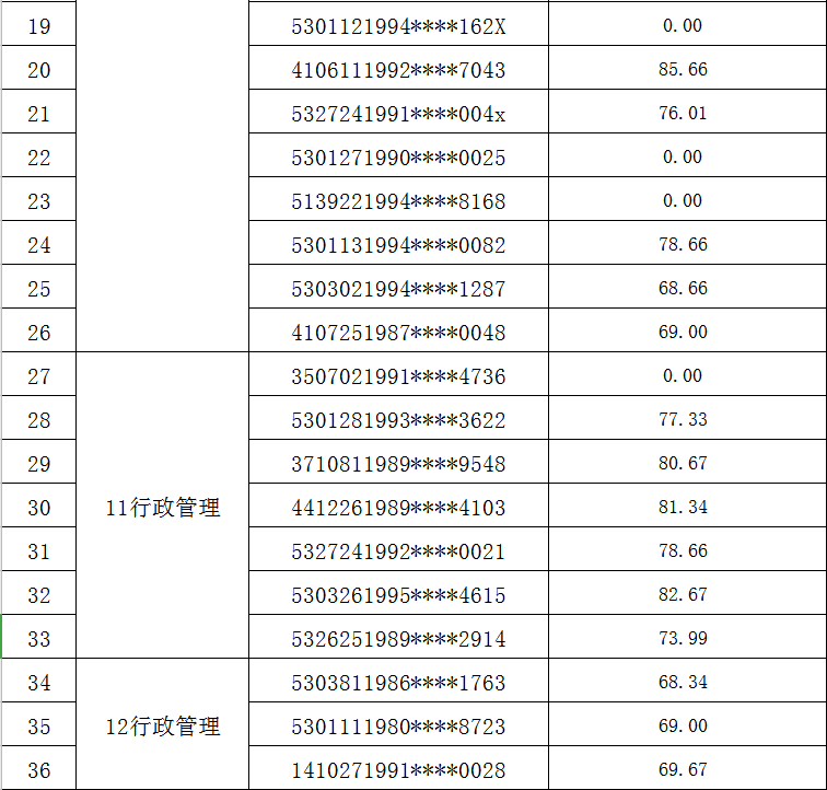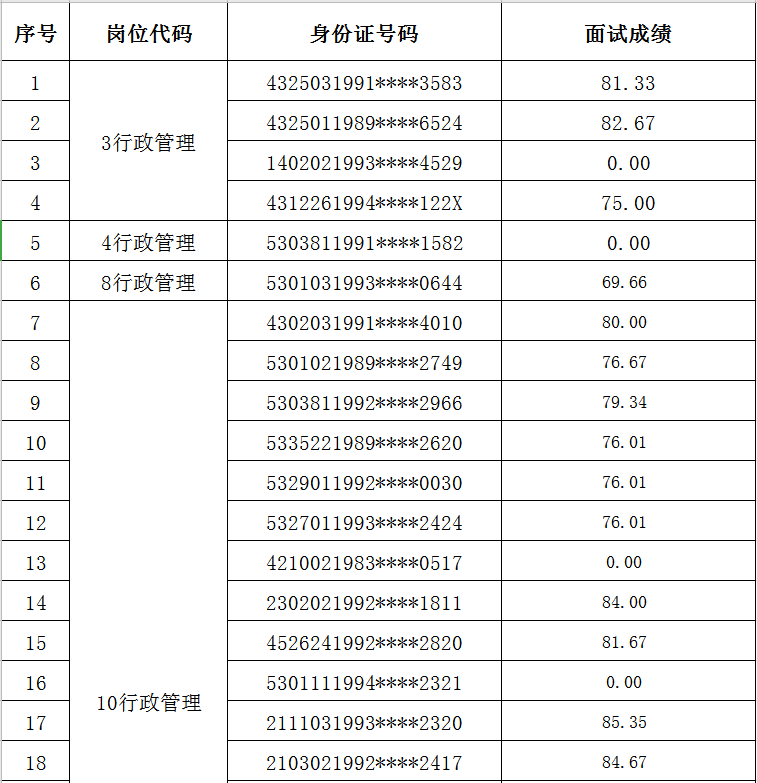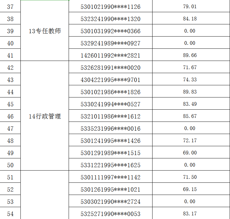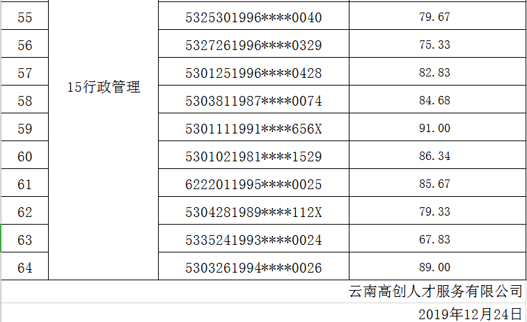 云南高创人才服务有限公司为云南艺术学院招聘劳务派遣制员工2019年12月20日面试成绩结果如下: