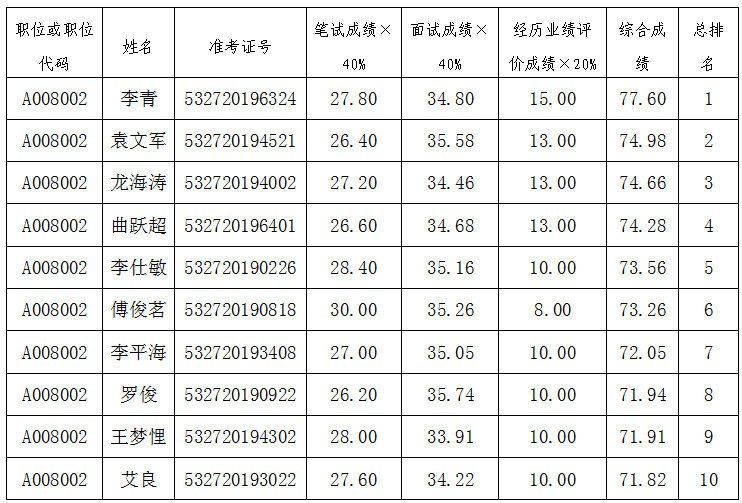 《普洱市强制隔离戒毒所2019年公开遴选公务员公告》(第4号)已于2020年1月19日发布,因考生对A008002岗位考生傅俊茗(准考证号532720190818)的“经历业绩评价”成绩提出异议,经重新对傅俊茗考生的“经历业绩评价”成绩进行复核确认,其确未满足“具有5年及以上司法行政机关、公安机关、人民法院、人民检察院工作经历之一”条件,所以“经历业绩评价”成绩由原来的10分更正为8分。现将第4号公告第二项“综合成绩”中A008002岗位综合成绩及排名情况作如下更正,原《普洱市强制隔离戒毒所2019年公开遴选公务员公告》(第4号)中其他内容不变。