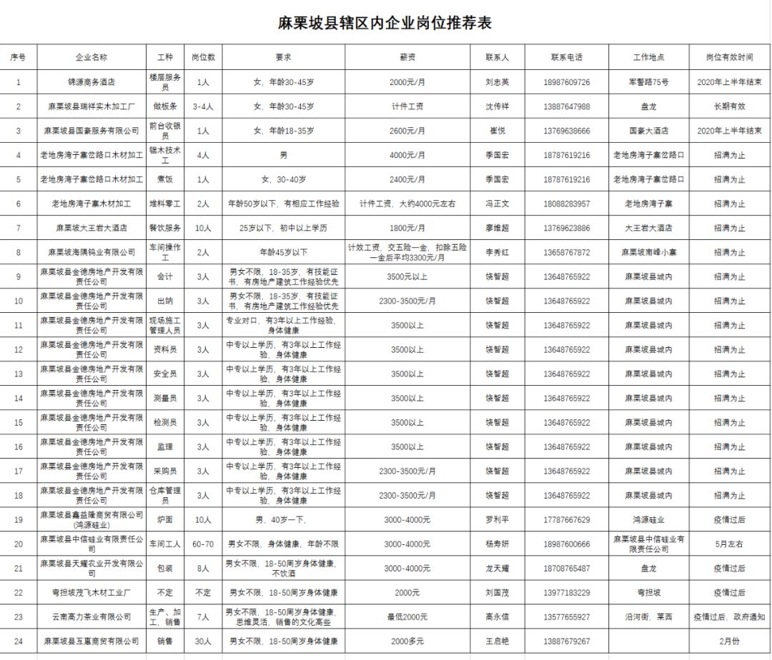 麻栗坡县辖区内企业岗位推荐表