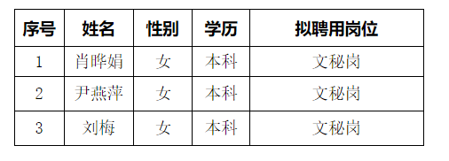 根据曲靖市公益性岗位招聘相关要求,经过公开报名、资格审查、面试、体检等程序,确定肖晔娟、尹燕萍、刘梅三名同志为中共曲靖市委统战部公益性岗位拟聘用人员。现将拟聘用人员予以公示。