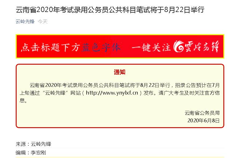 云南省2020年考试录用公务员公共科目笔试将于8月22日举行,招录公告预计在7月上旬通过“云岭先锋”网站(http://www.ynylxf.cn)发布。请广大考生及时关注官方信息。