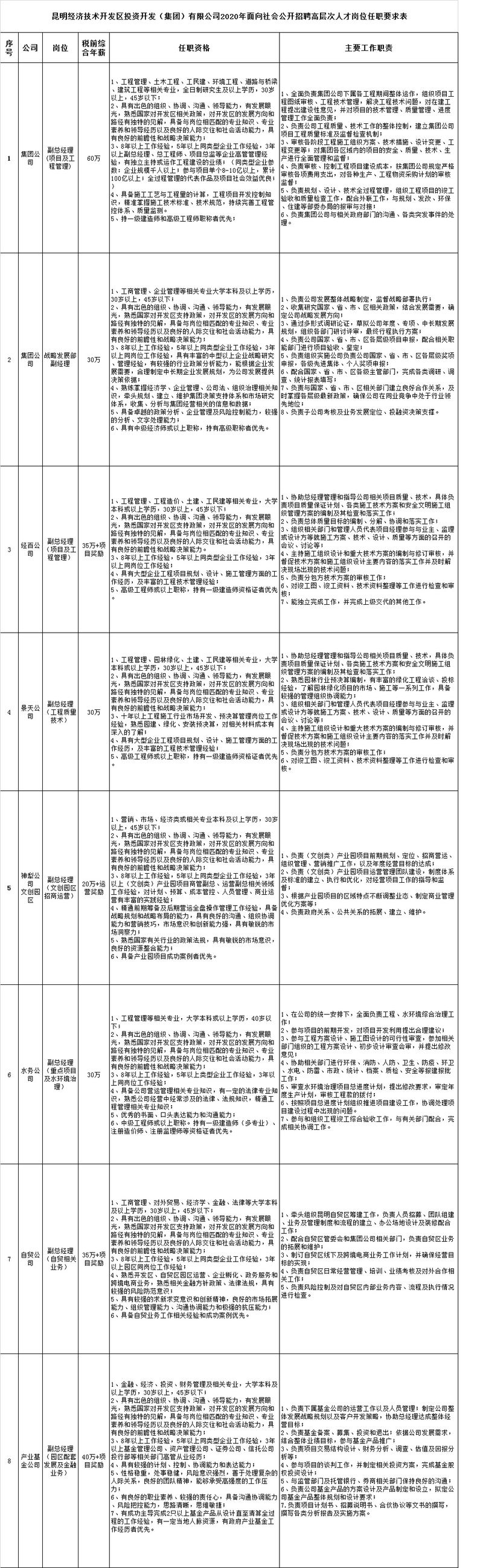 除上述条件外,应聘者还应当符合《昆明经济技术开发区投资开发(集团)有限公司2020年面向社会公开招聘高层次人才岗位任职要求表》中要求的资格条件。