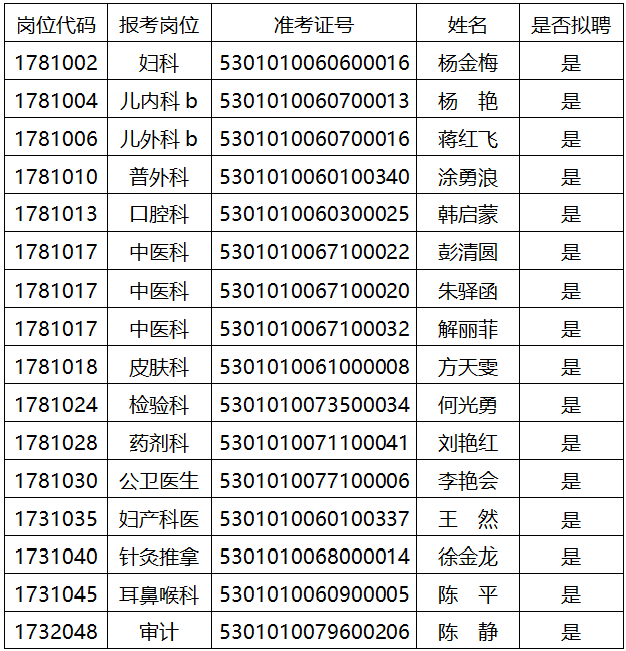 根据《云南省应对新冠肺炎影响大幅增加名额面向全国开展医疗卫生机构专项招聘优秀高校毕业生(省本级)的公告》招聘工作安排,现将云南省妇幼保健院拟聘人员名单进行公示。