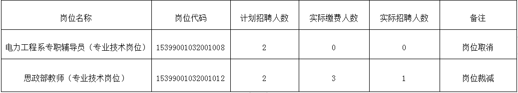 根据《云南水利水电职业学院 2020年公开招聘事业编制工作人员公告》的相关规定,现将云南水利水电职业学院2020年事业单位公开招聘事业编制工作人员计划招聘人数与实际缴费人数未达1:3开考比例的部分岗位予以取消和裁减,特此公告。