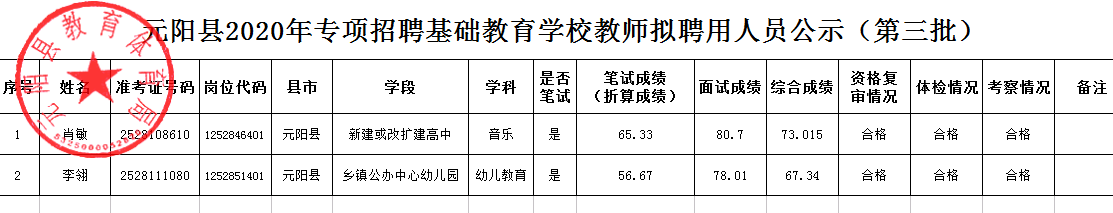 根据《红河州应对新冠肺炎疫情影响大幅增加名额面向全国开展基础教育学校专项招聘优秀高校毕业生公告》、《红河州教育体育局关于红河州2020年基础教育学校教师专项招聘资格复审、面试及体检等有关事项的通知》相关规定和要求,经报名、资格初审、笔试、资格复审、面试、体检和考察等程序,现将元阳县2020年云南省专项招聘基础教育学校教师第三批拟聘用人员予以公示: