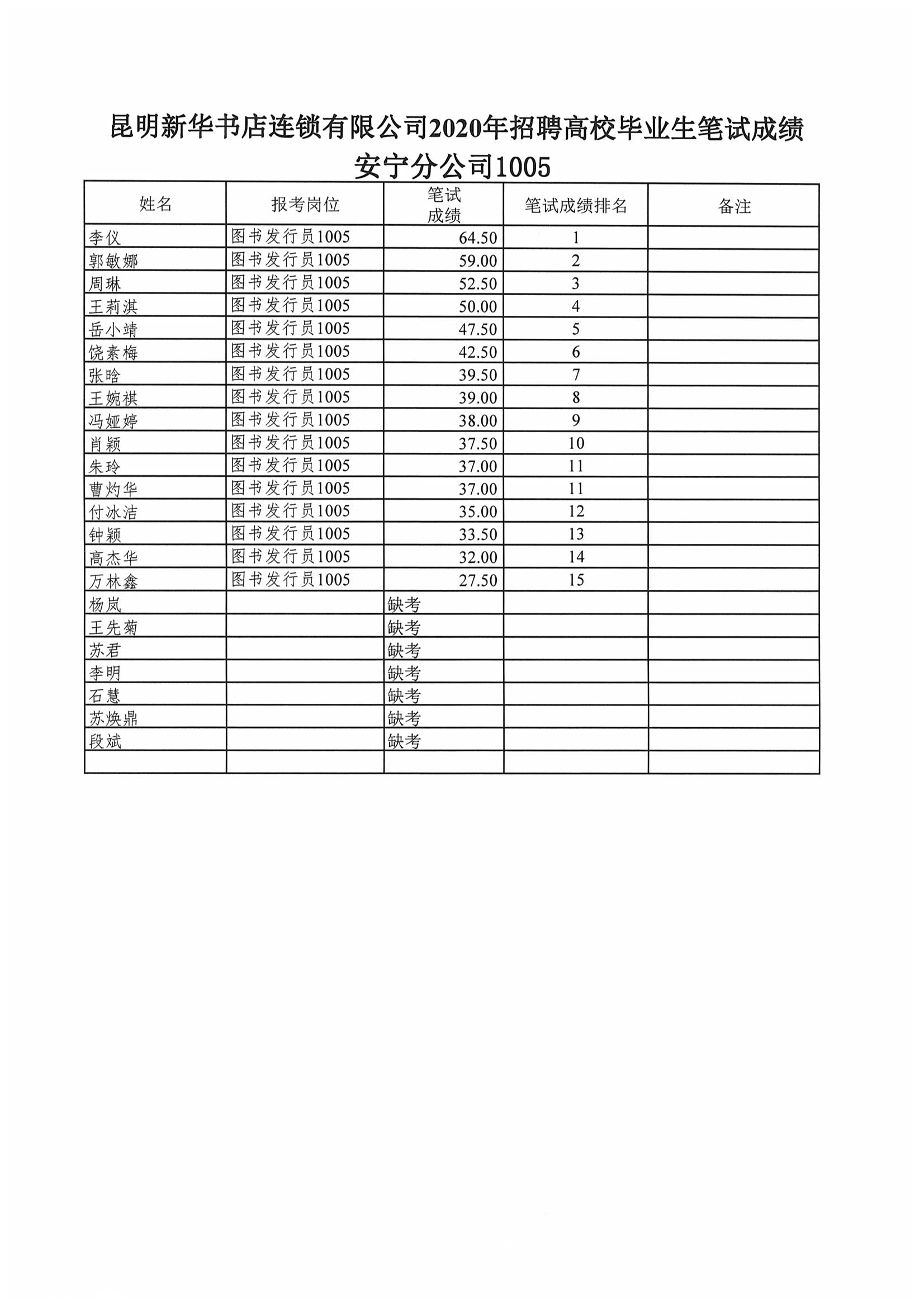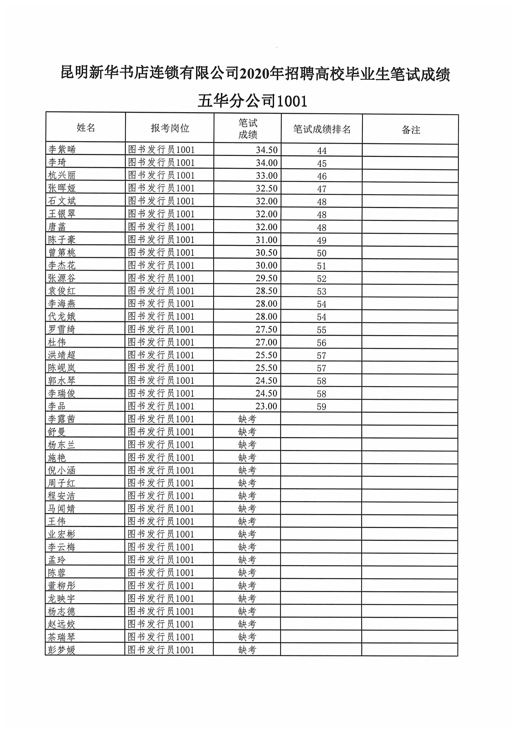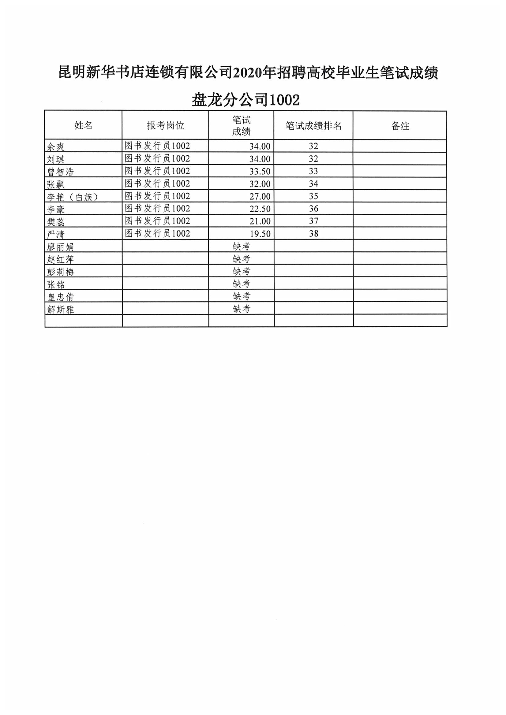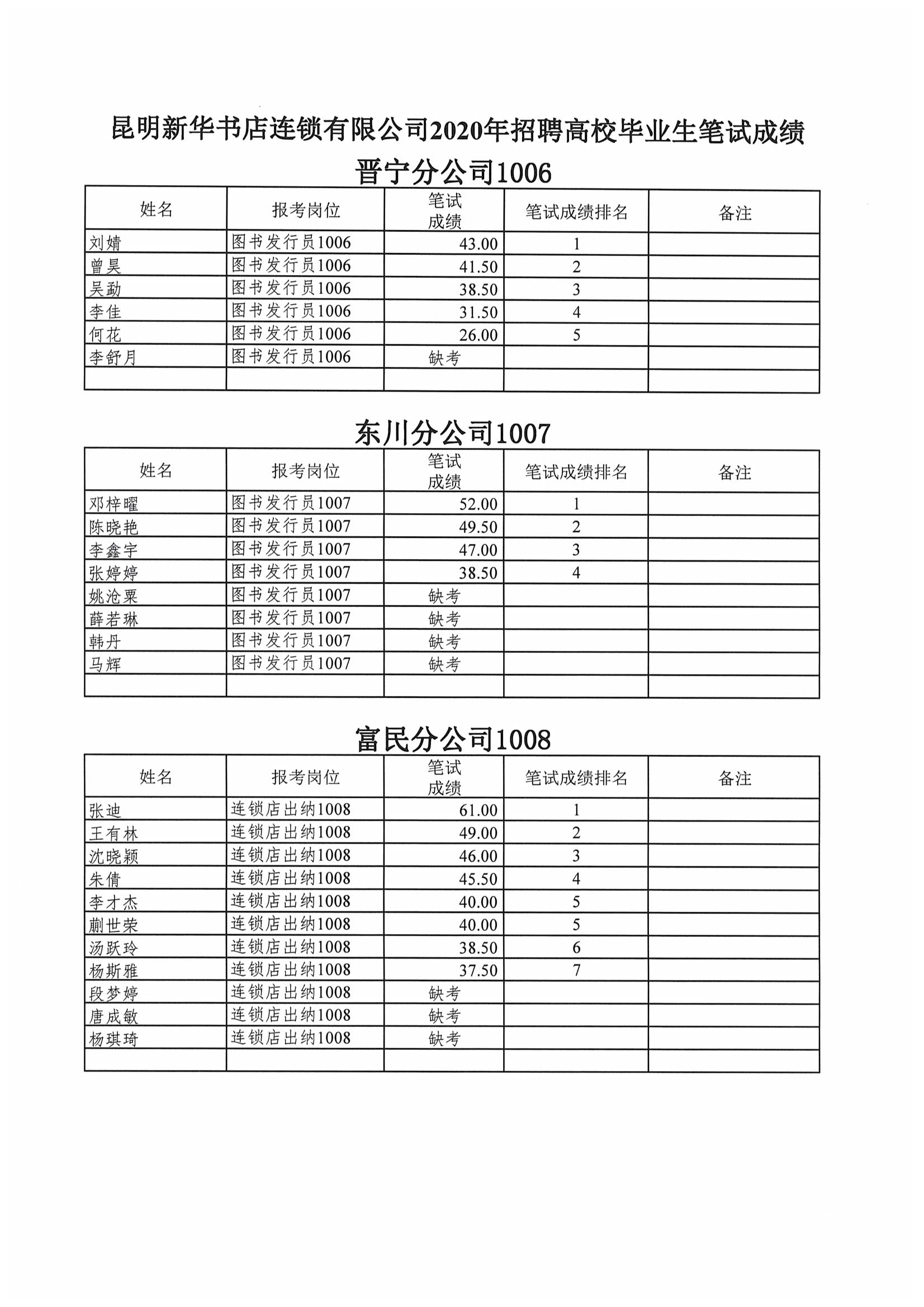 昆明新华书店连锁有限公司2020年招聘高校毕业生笔试成绩公示