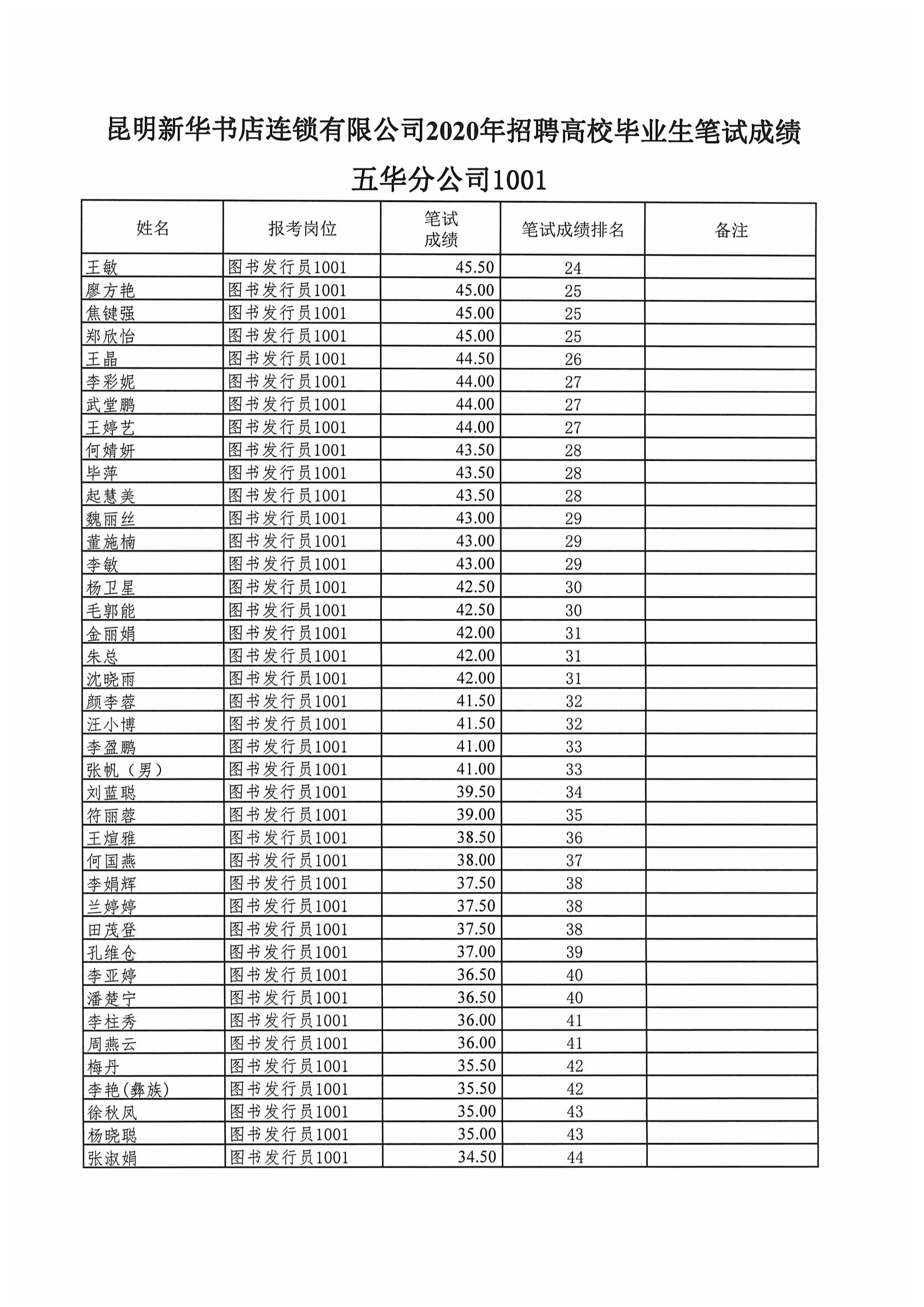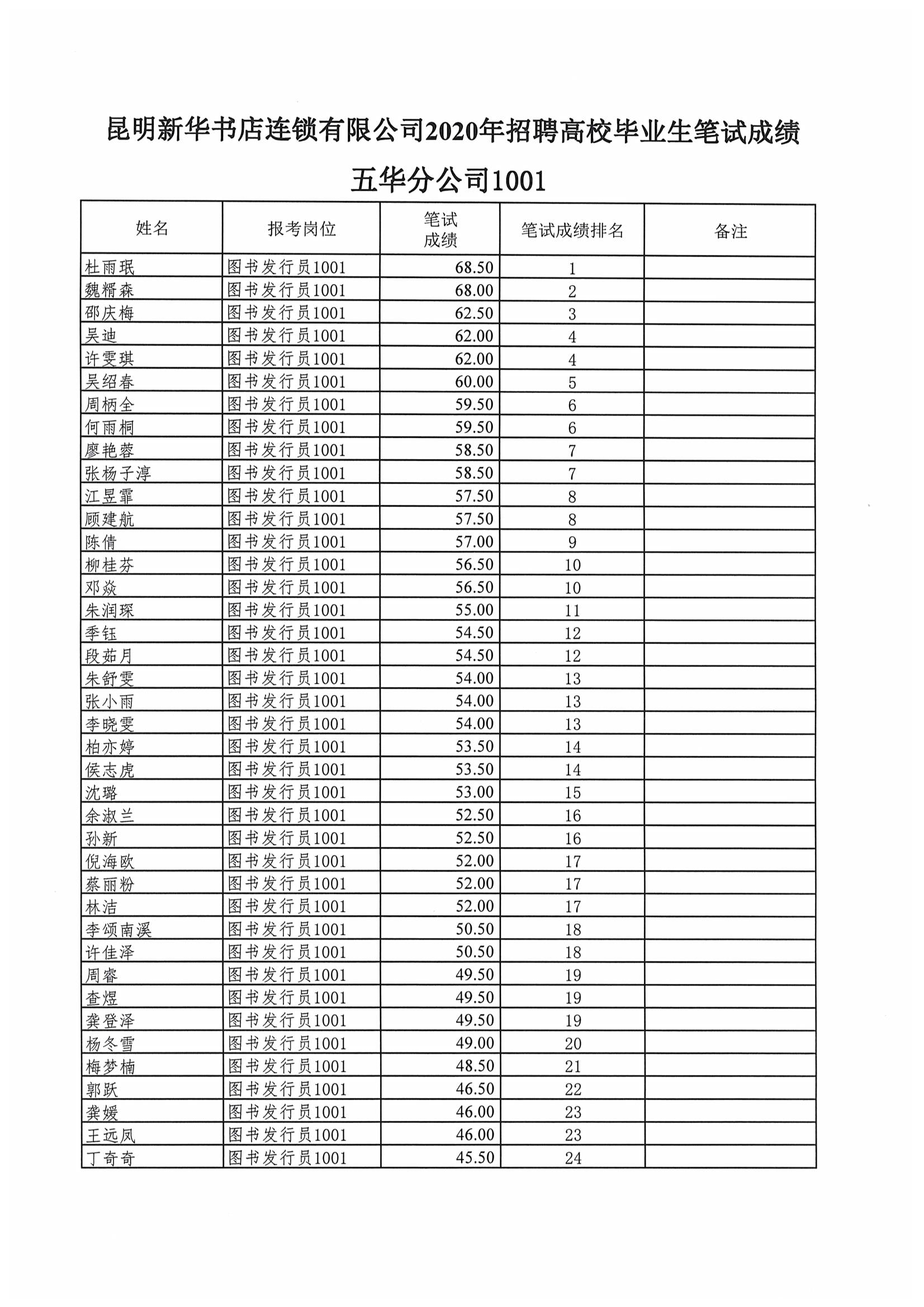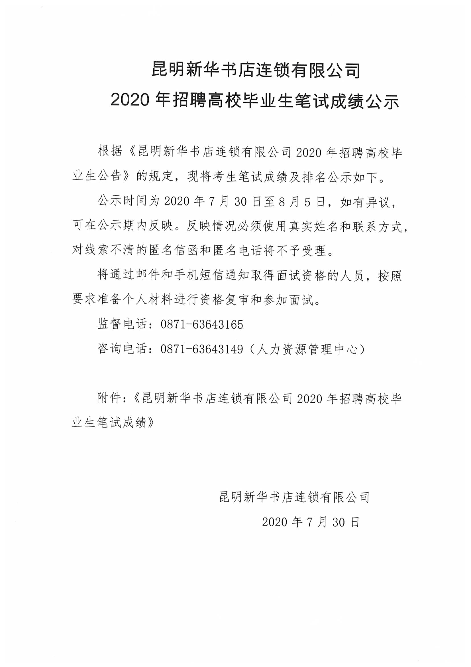 昆明新华书店连锁有限公司2020年招聘高校毕业生笔试成绩公示