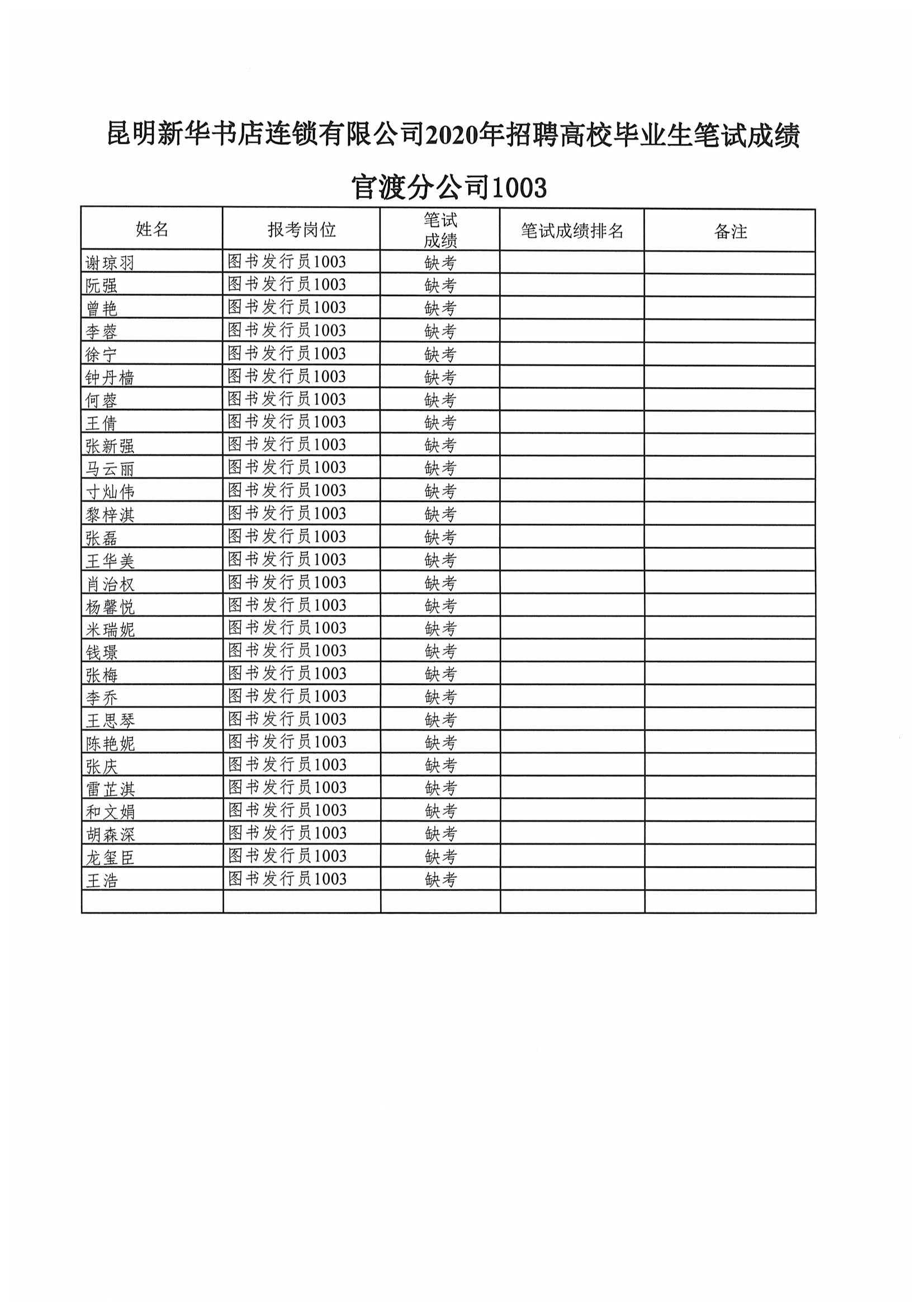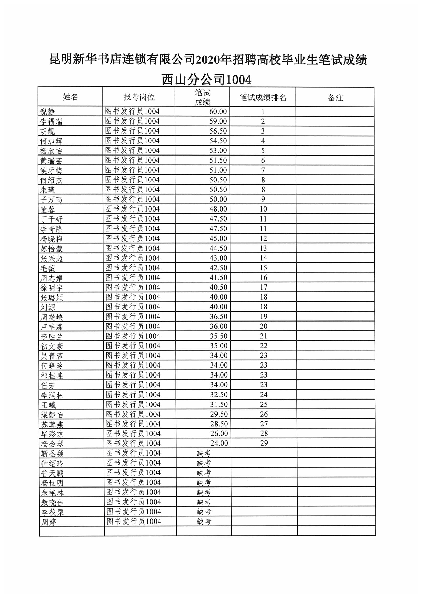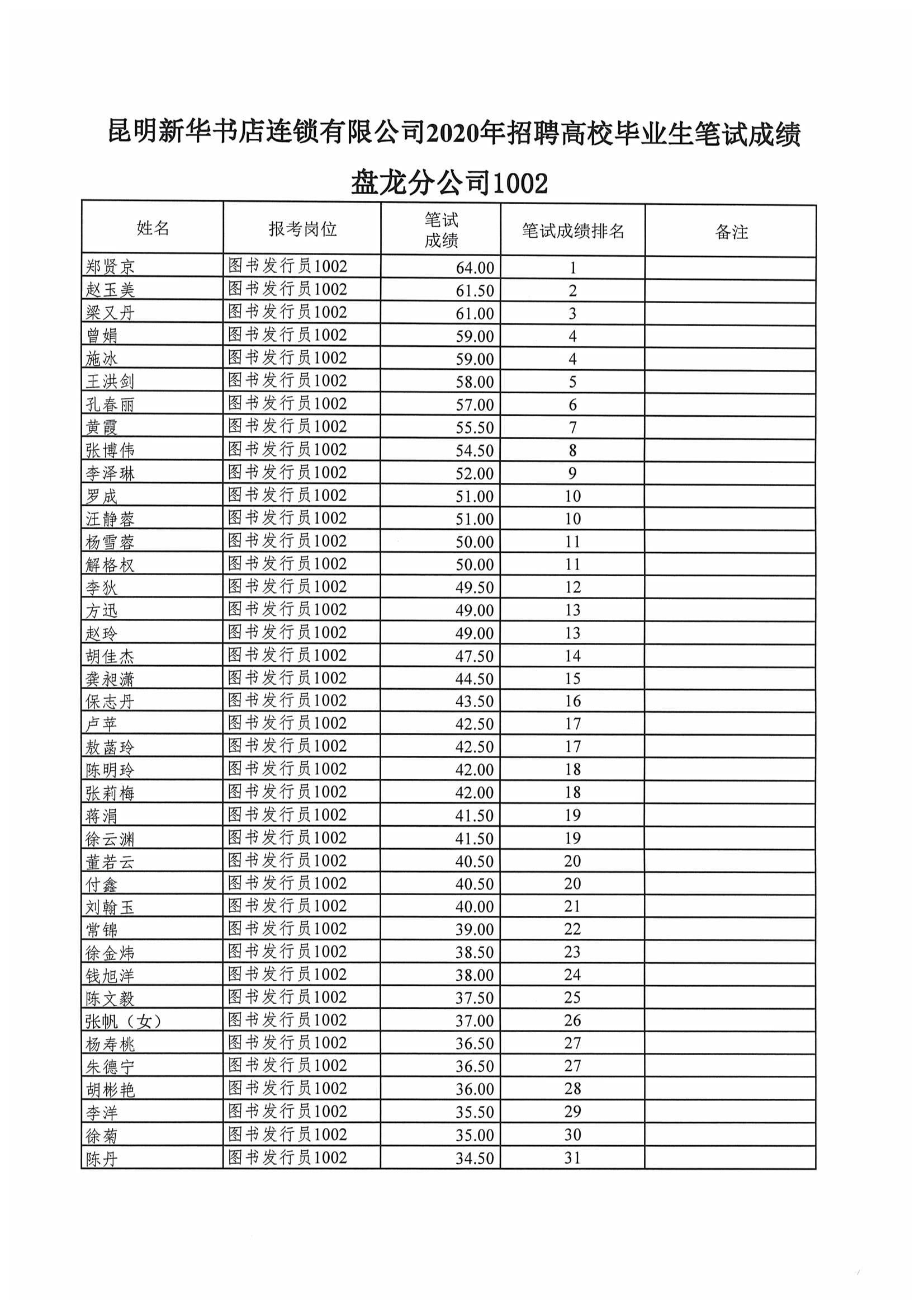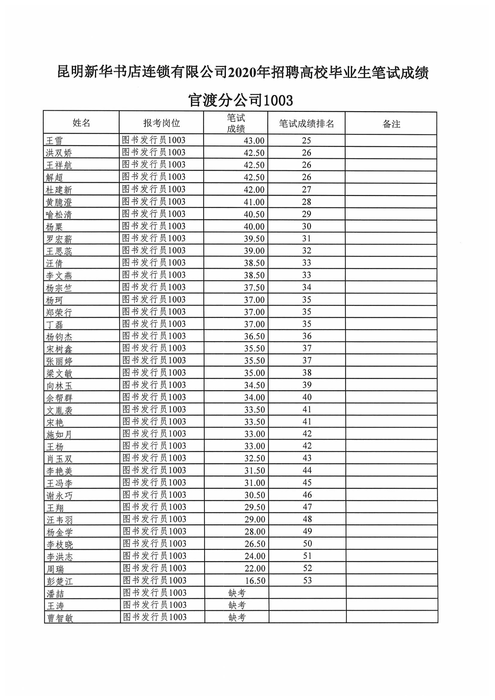 昆明新华书店连锁有限公司2020年招聘高校毕业生笔试成绩公示