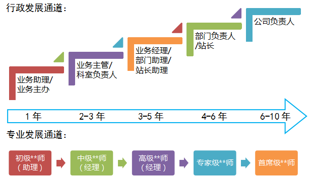 公司提供双向的员工发展通道,行政与专业发展通道可相互打通,交流无障碍。职业通道横向到边、纵向到底、覆盖全员,发展通道与岗位、职级、薪酬等体系形成无缝对接。