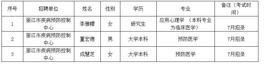 为进一步充实和优化丽江市医疗卫生人才队伍,经市人社、市委编办核准,丽江市卫生健康委直属的医疗卫生单位分别于2020年1月、3月、7月开展了急需紧缺人员校园招聘、网络招聘等招聘工作,现对经面试、考察、体检合格的第二批拟聘人员3人的名单进行公示。